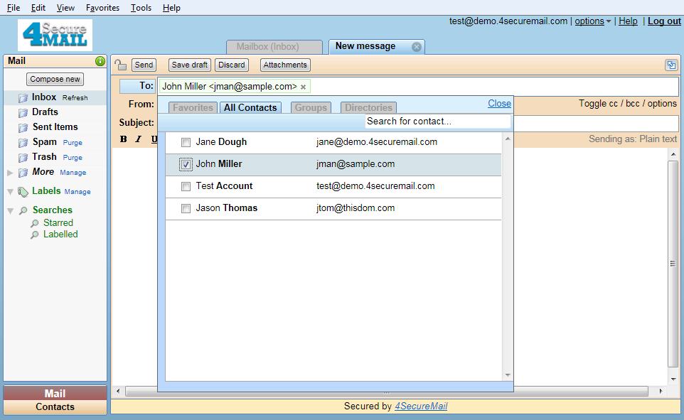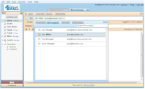 The picker allows quick selection of multiple recipients to your email. Click the To: button, optionally filter by search criteria, and select the addresses you want to add. Once added, contacts can be removed from the recipient list by clicking its small x.